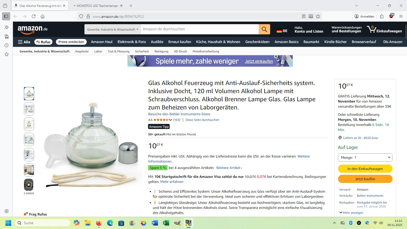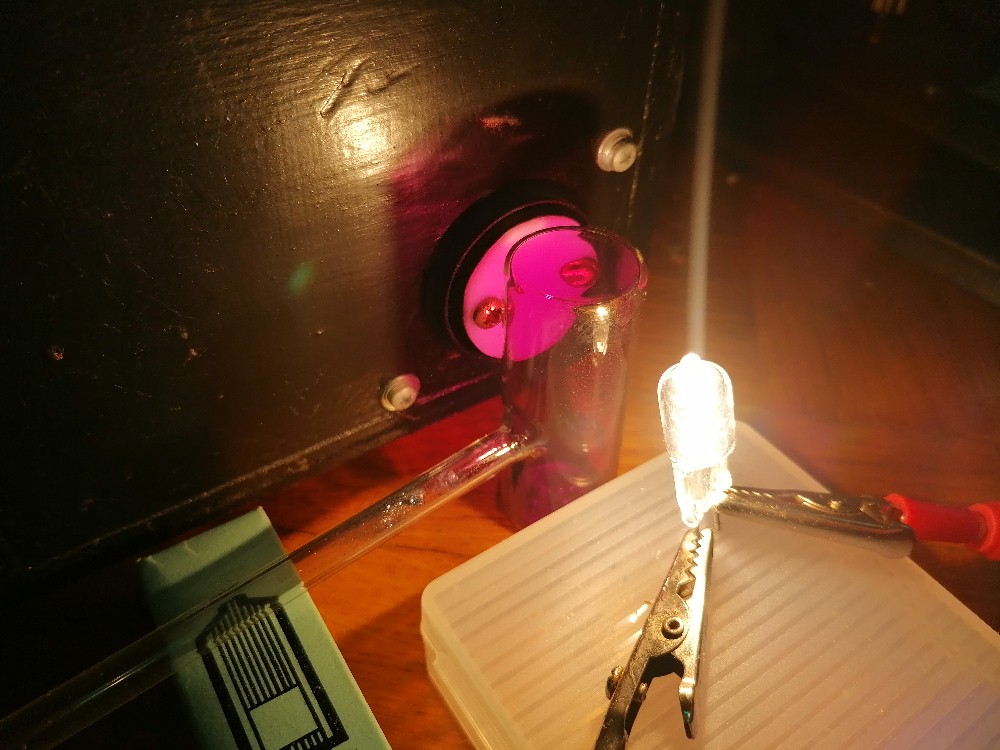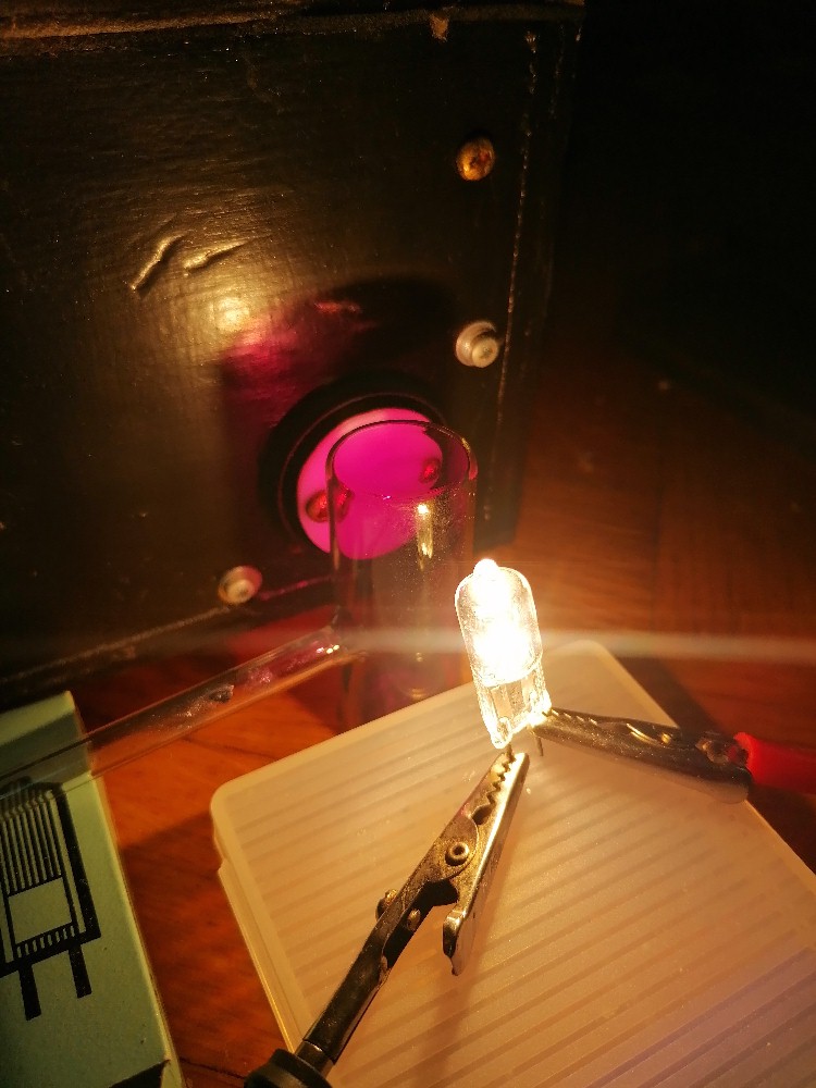 Das dritte Experiment entspricht genau dem zweiten mit dem Unterschied, dass ich nun die Resonanzabsorption von Iod anstelle von Natrium nachweisen möchte. Auf aliexpress gibt es eine mit Iod gefülltes Glasgefäß sehr günstig zu kaufen: