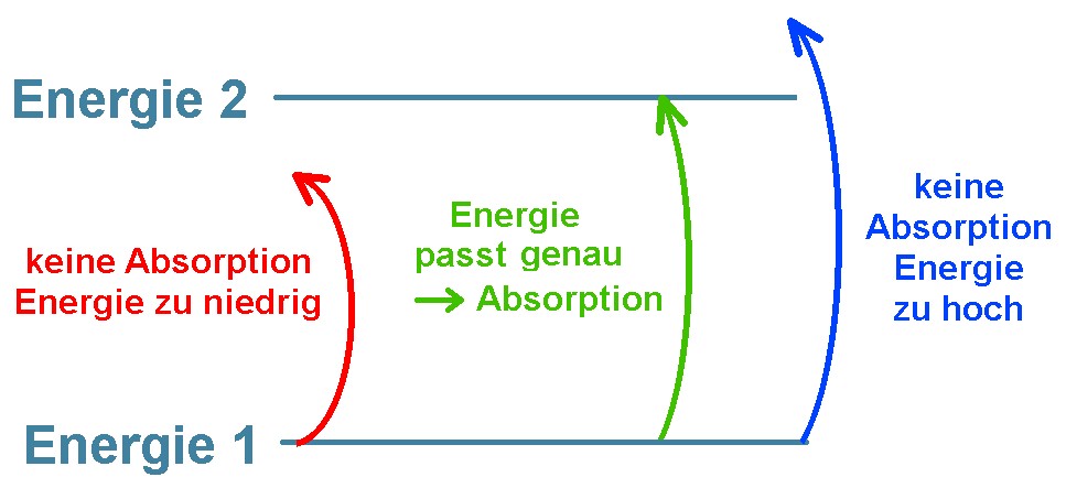 Die Energie des absorbierten Photons muss genau für den Sprung passen. Sie darf weder zu gering, noch zu hoch sein. Im oberen Bild wird also nur grünes Licht verschluckt und dient zur Anregung des Elektrons.