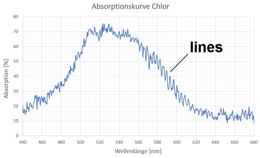 Mittels beider Intensitätsverläufe (nur Halogen bzw. Halogen + Jod) lässt sich das Absorptionsspektrum von Jod ermitteln, wobei gilt: Absorptionsgrad = 100% – (Imit Jod / Iohne Jod) · 100. Der mit Excel erstellte Graph sieht dann wiefolgt aus: