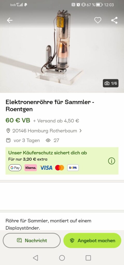 Mittels 60 keV Gammastrahlen hatte ich hier (https://stoppi-homemade-physics.de/bragg-reflexion/) bereits versucht, die Braggreflexion an einem Kristall nachzuweisen. Leider war mein Gammastrahler dafür viel zu schwach. Dieses Experiment möchte ich nun mit einer Röntgenröhre wiederholen. Dazu habe ich mir auf Kleinanzeigen.de eine alte, gebrauchte Röntgenröhre besorgt: