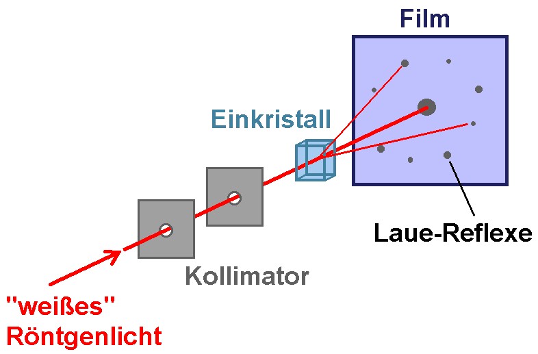 Mit Röntgenstrahlung lassen sich sog. Lauediagramme erstellen, welche als Nachweis für die kristalline Struktur diverser Materialien dienen. Dazu wird kontinuierliche Röntgenstrahlung auf einen Kristall gelenkt. Durch Braggreflexion kommt es sodann zur Reflexion nur in ganz bestimmte Richtungen. Es muss ja die Bragggleichung sin(φ) = n · λ / 2 · d erfüllt sein!