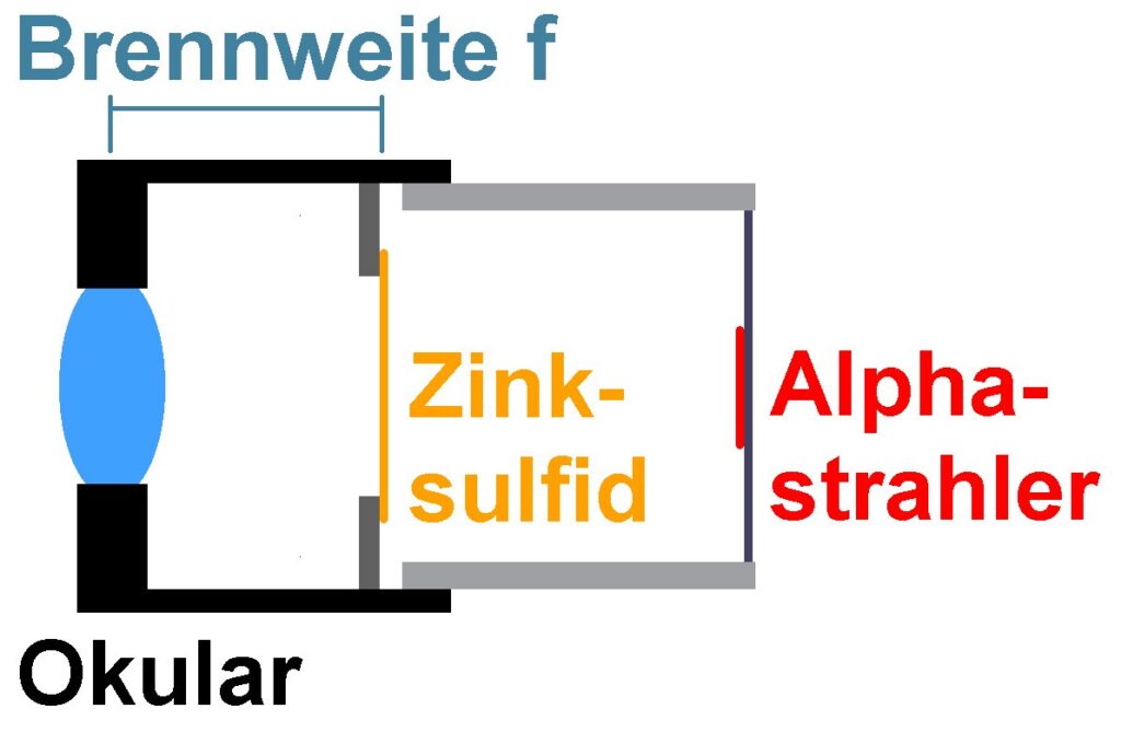 Achtung: Die Zinksulfidschicht ist auf einem Trägermaterial aufgebracht. Dieses können die Alphateilchen nicht durchdringen. Daher muss die Zinksulfidschicht in Richtung Okularöffnung und nicht in Richtung Linsen zeigen!