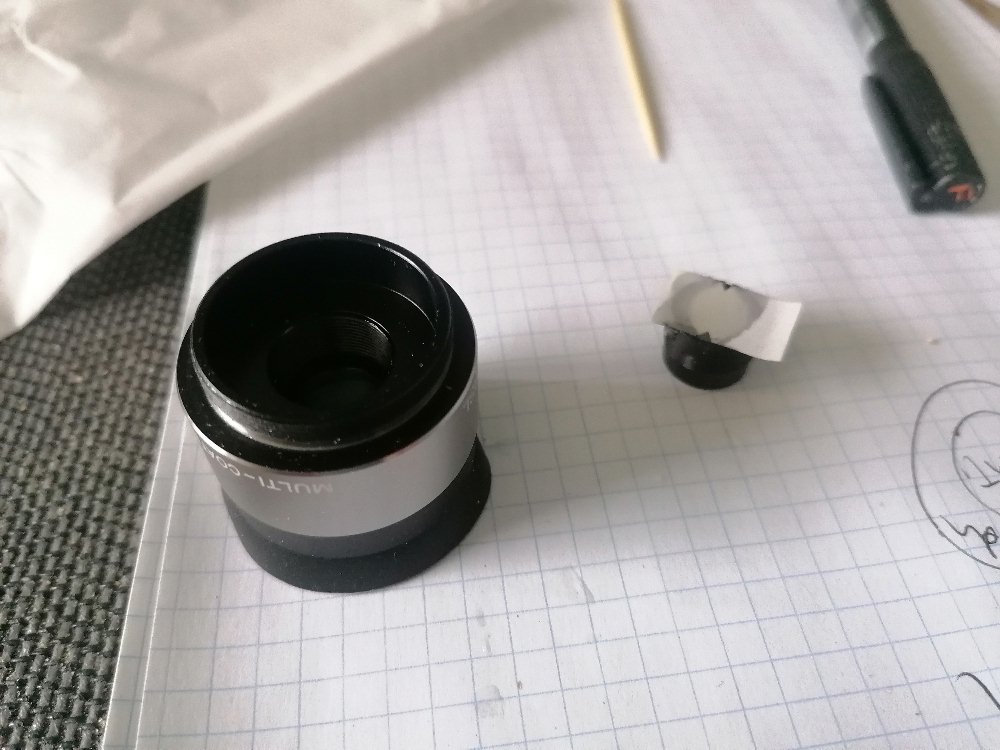 Diese durchs Spinthariskop sichtbaren Lichtblitze wollte ich natürlich auch mit einer Kamera aufzeichnen. Dazu habe ich mir eine „Night-vision“-App heruntergeladen und die Smartphonekamera vor die Okularlinse gehalten. Leider waren selbst bei größter Verstärkung keine Lichtblitze zu sehen, nur Rauschen.