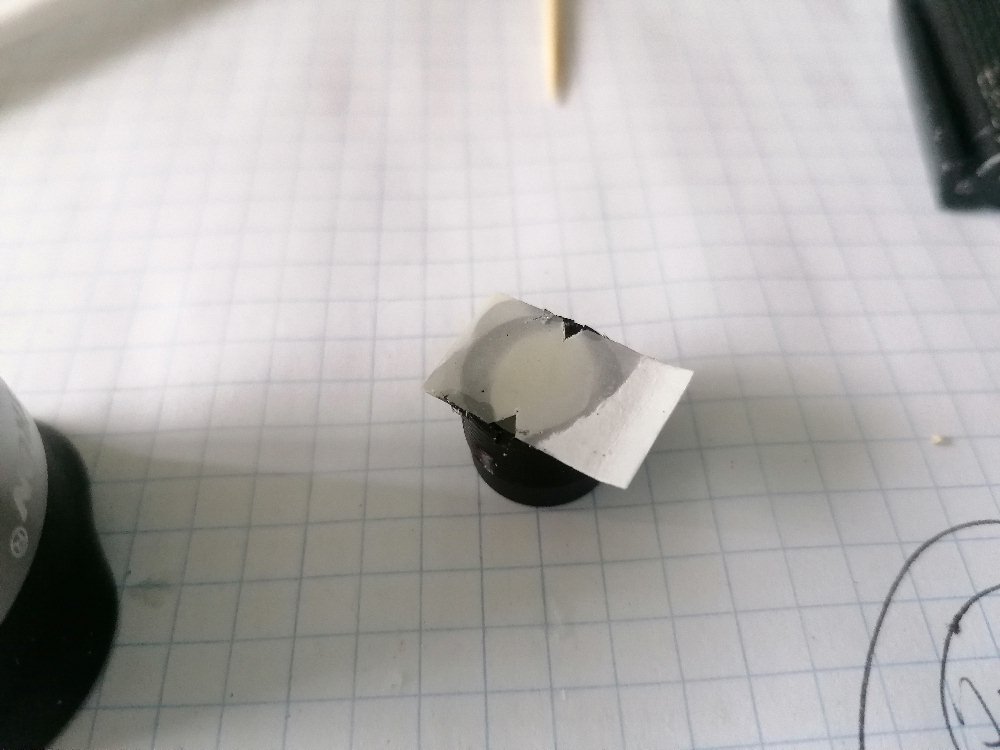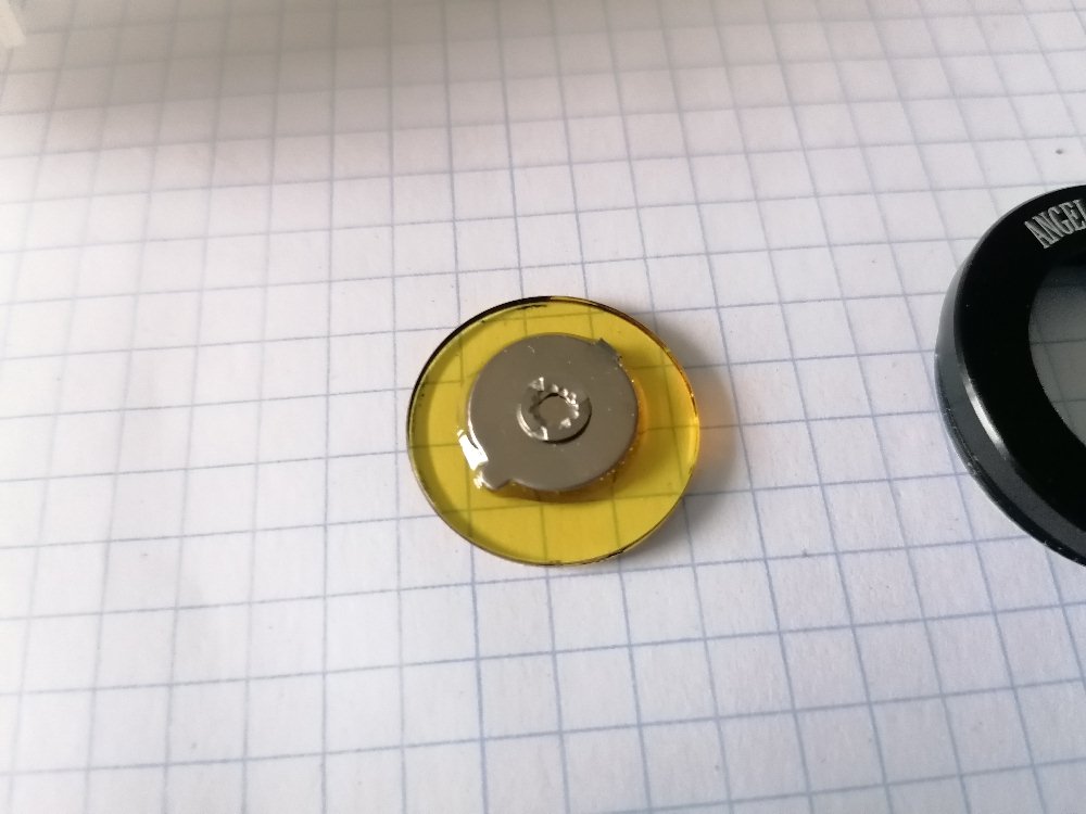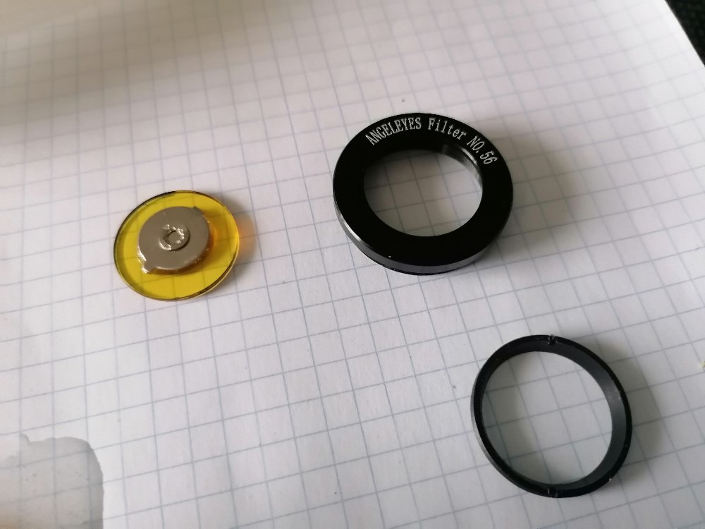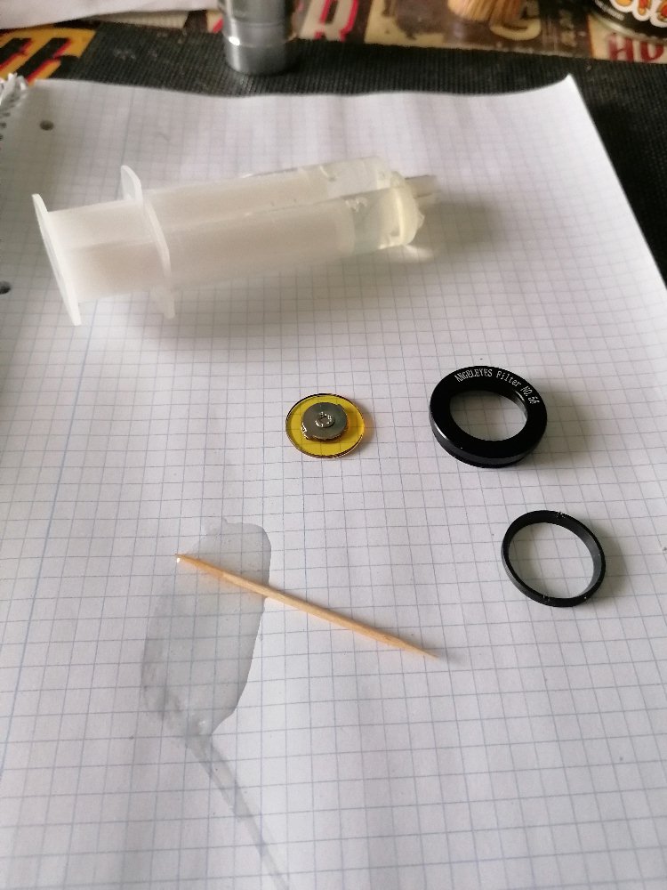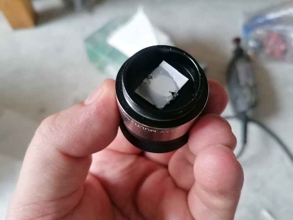 Damit man den Alphastrahler nicht ständig mit der Hand vor der Zinksulfidschicht postieren muss, habe ich diesen auf einen Okularfilter geklebt. Der Filter lässt sich sehr bequem in die Okularöffnung schrauben. Im Umgang mit den radioaktiven Strahler ist natürlich wieder größte Vorsicht geboten!