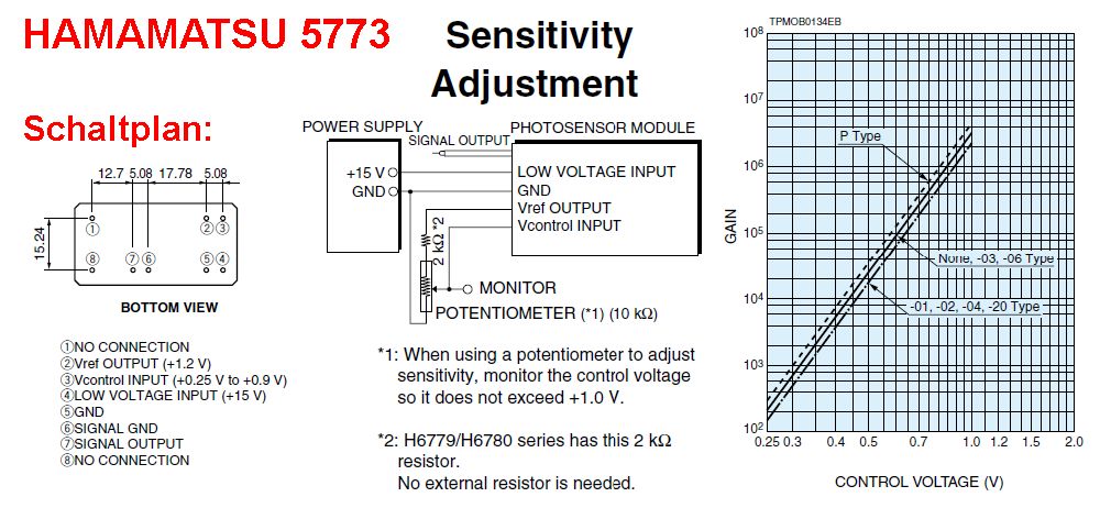 Daher musste ich mir etwas anderes einfallen lassen. Zum Glück hatte ich noch einen sehr kompakten Photomultiplier der Firma Hamamatsu mit integrierter Hochspannung in meinem Fundus: