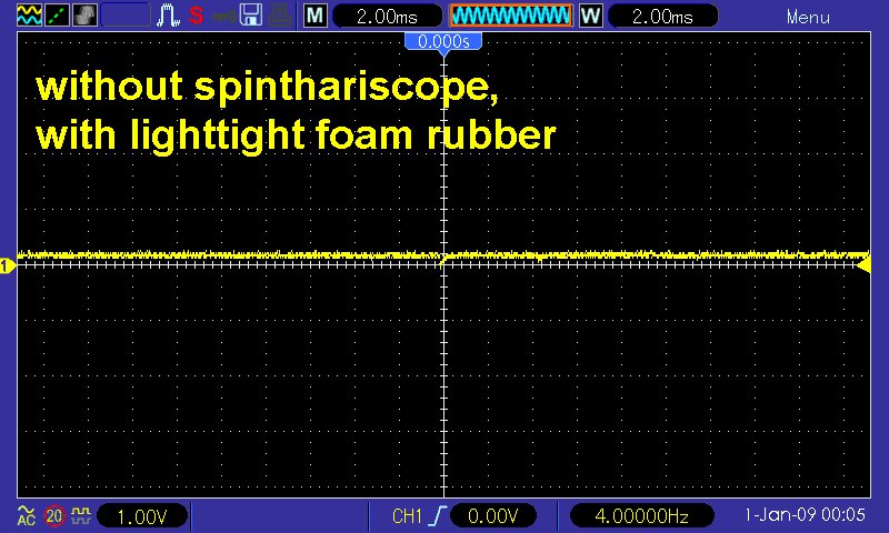 Ohne Spinthariskop in der Metallbox und damit ohne Lichtblitze zeigte das Oszilloskop wie zu erwarten/hoffen war keinerlei Pulse: