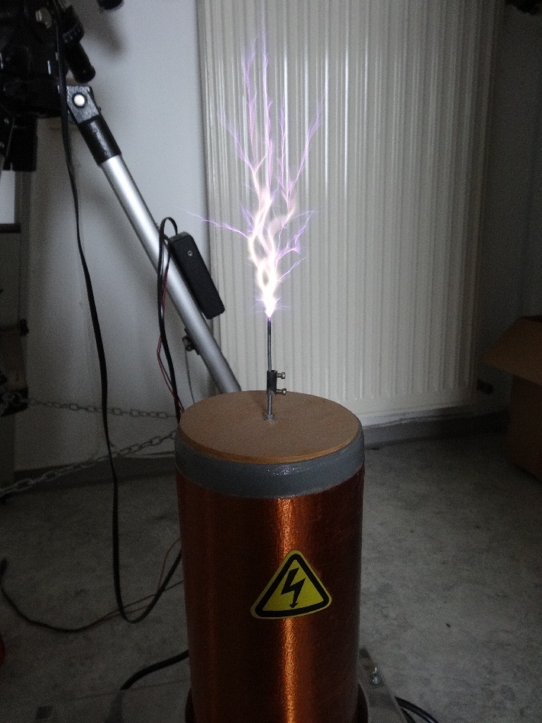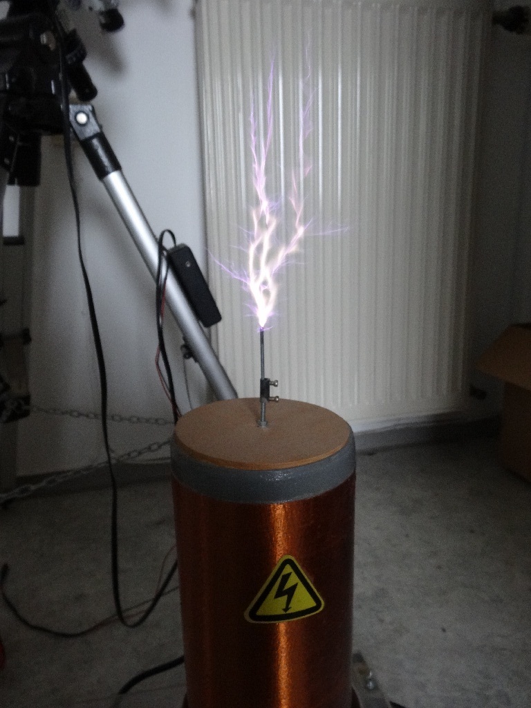 SSTC steht für solid state tesla coil. Anders als bei einer SGTC mit ihrem Hochspannungstrafo und Funkenstrecke kommen bei einer SSTC nur elektronische Bauteile und keine Hochspannung zum Einsatz.