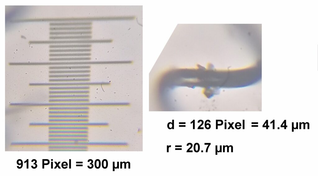 Vom Wolframdraht kenne ich nun den Widerstand R und den spezifischen Widerstand ρ. Den Radius r ermittle ich mit dem Mikroskop meiner Tochter. Dazu vergleiche ich die Drahtdicke mit einer 10 µm-Skala: