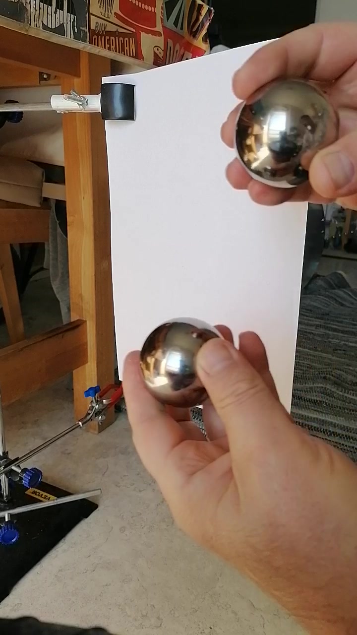 Nun hält der Versuchspartner das Blatt Papier und der andere knallt beide Kugeln so aufeinander, dass sich das Papierblatt bei der Kollision genau zwischen den beiden Kugeln befindet.