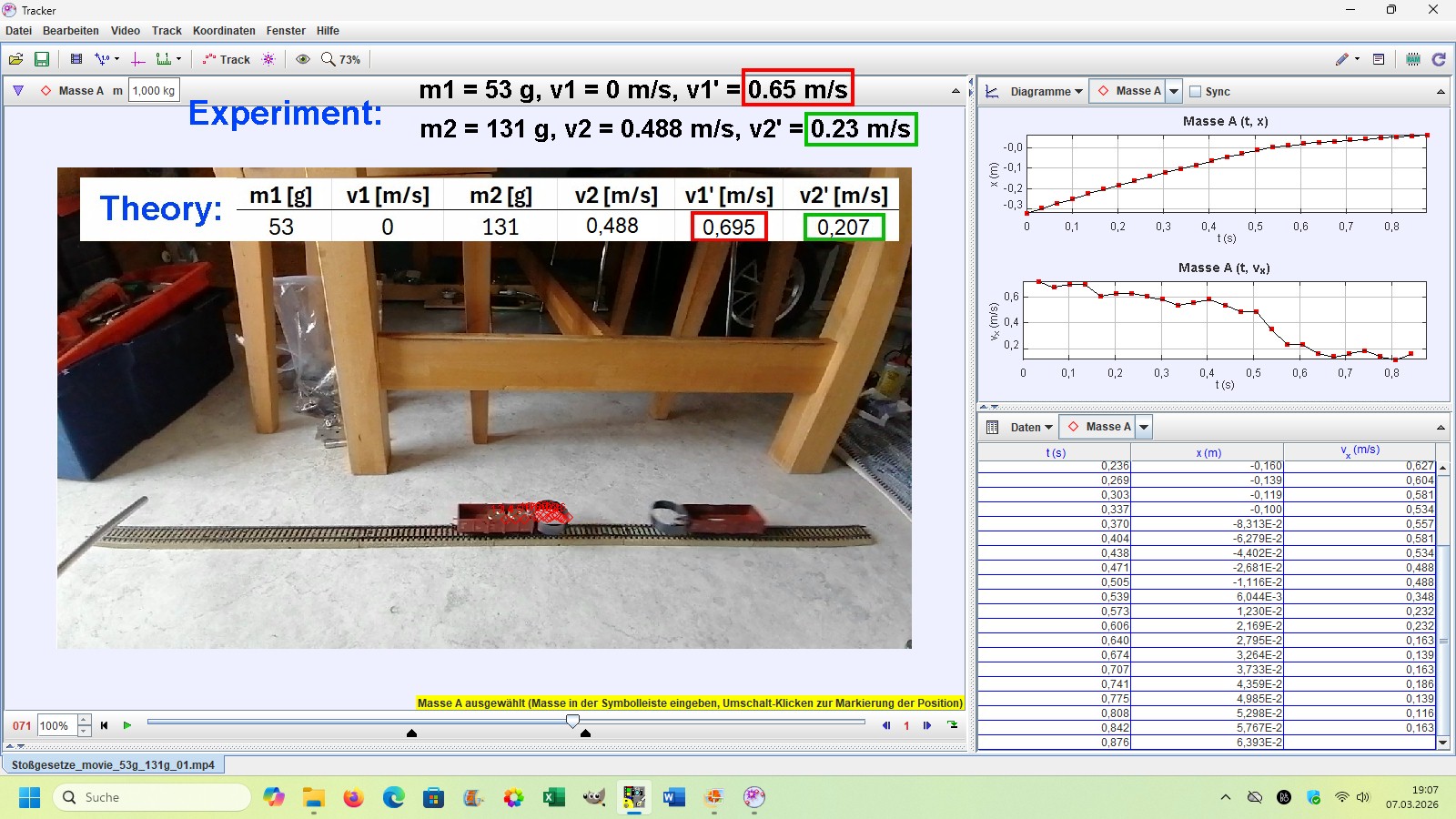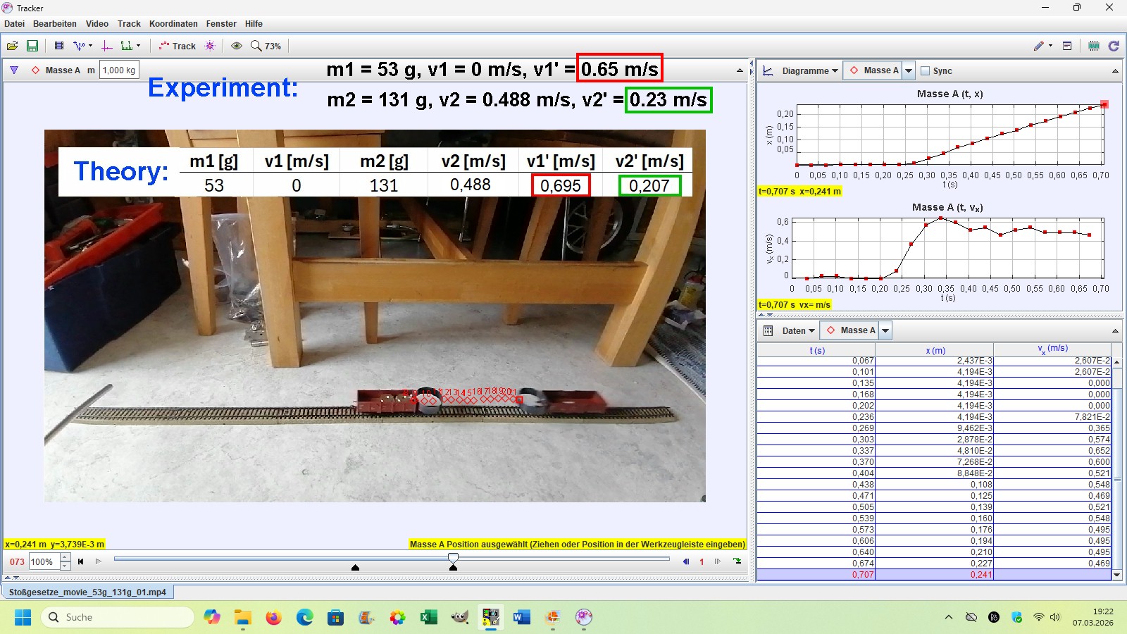 Die experimentelle Auswertung erfolgt per Videoanalyse mit der Software Tracker (https://opensourcephysics.github.io/tracker-website/).