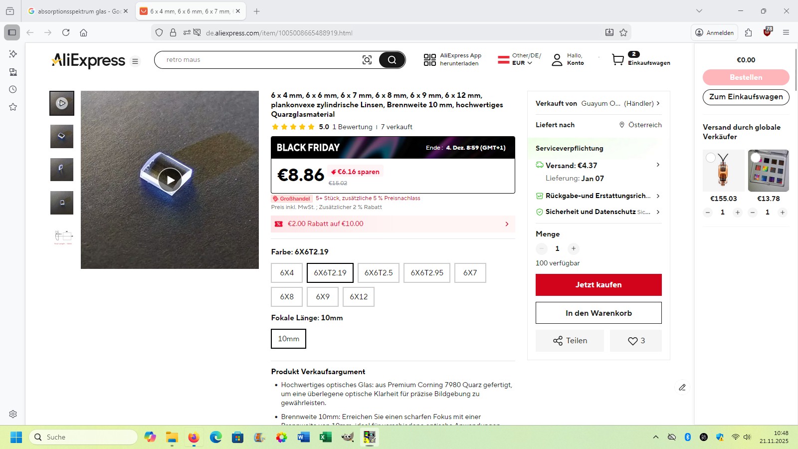 Zum Fokussieren des UV-Laserstrahls kommt eine Zylinderlinse zum Einsatz. Auch diese gibt es auf aliexpress in unterschiedlichen Ausführungen: