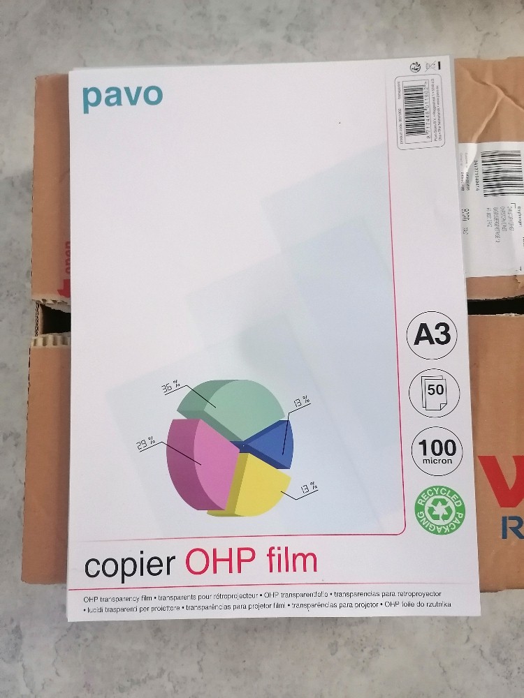 Die bisher verwendete A4 Overheadfolie war eigentlich zu klein für den Aufbau. Daher kaufte ich mir eine im A3-Format mit 100 micron (= 0.1 mm) Dicke: