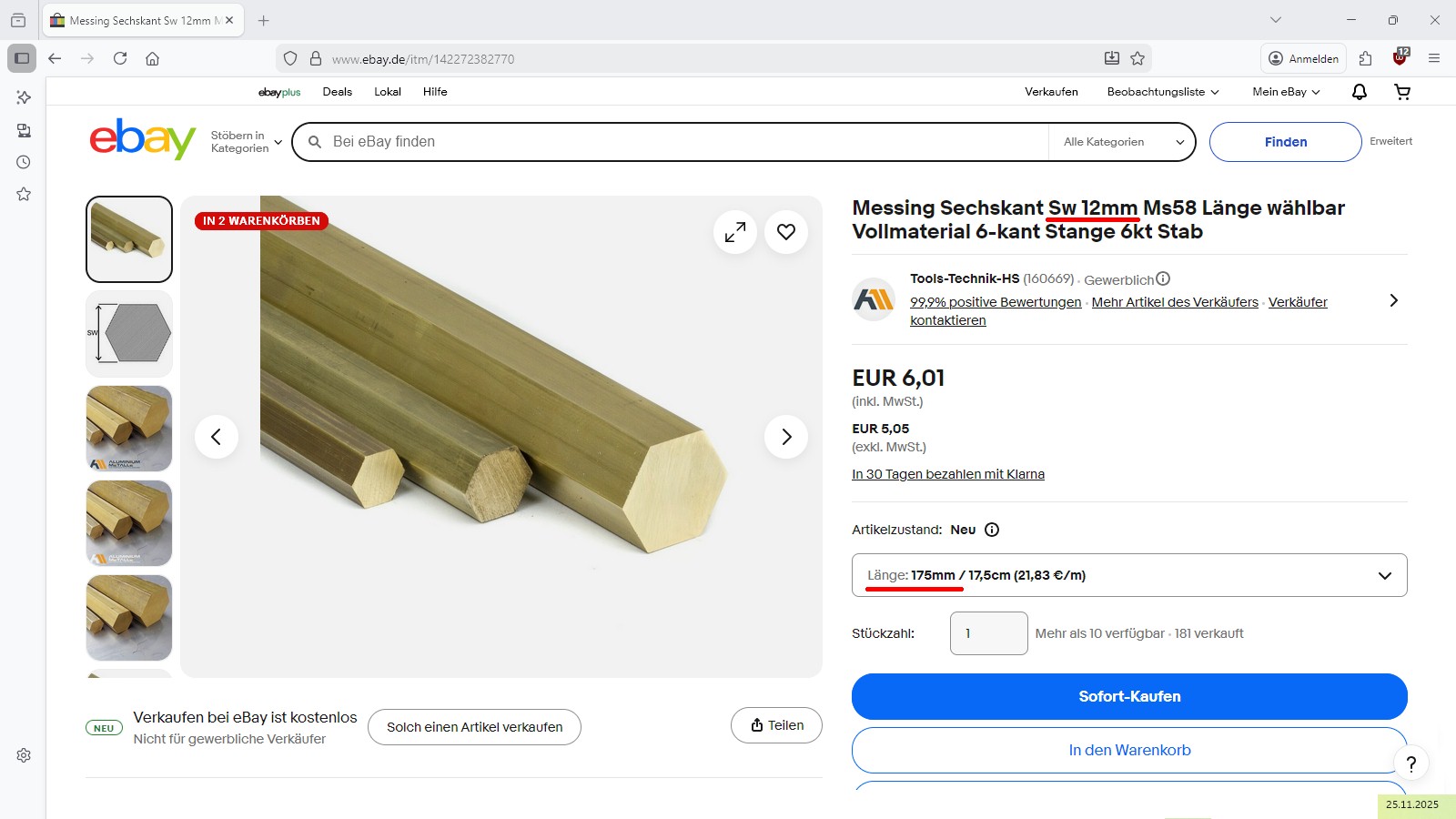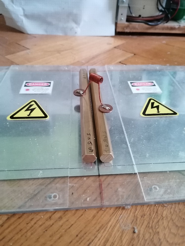 Ganz zufrieden bin ich mit dem Output noch nicht. Ich erhalte auch keine durchgängige Glimmentladung zwischen den Metallschneiden, sondern an einigen Stellen immer eine starke Funkenentladung trotz feiner Justierung der Schneiden. Diese ist eigentlich beim TEA-Laser unerwünscht. Im Internet kursieren einige Anleitungen, welche für den Laserkanal einen Sechskantstab verwenden. Dies möchte ich auch noch ausprobieren. Daher habe ich mir auf ebay zwei 175 mm lange Sechskantstäbe aus Messing bestellt: