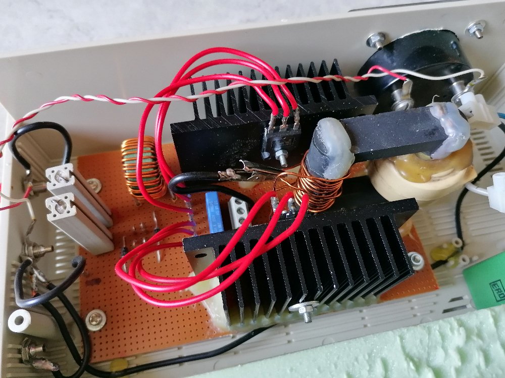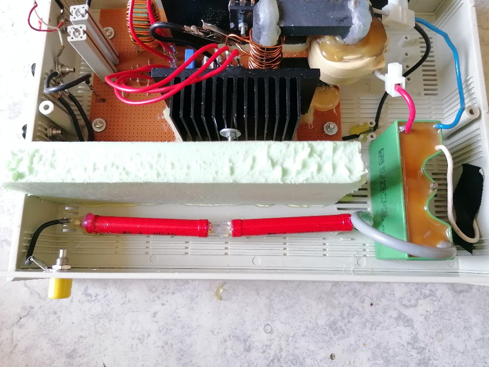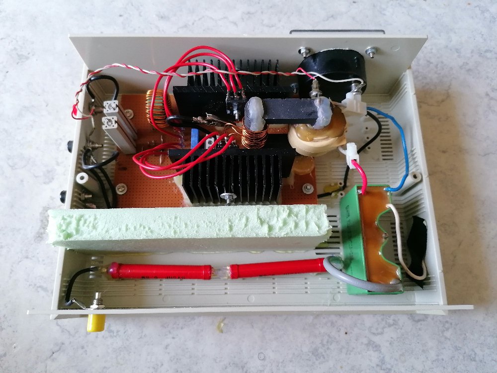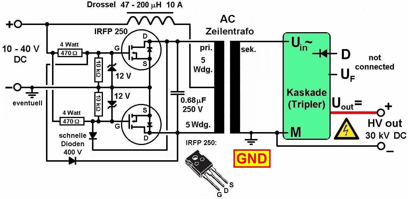 Für dieses Experiment benötigt man wie schon erwähnt eine DC-Hochspannungsquelle. Diese habe ich mit basierend auf einem AC-Zeilentrafo in Kombination mit einer alten TV-Kaskade selbst gebastelt: