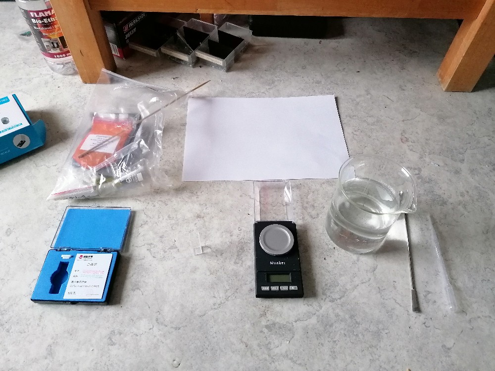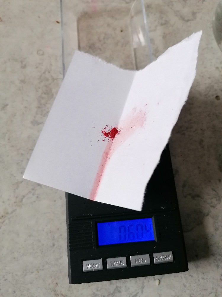 Zum Erstellen der richtigen Verdünnung verwendete ich meine günstige Milligrammwaage. In 3 ml Ethanol kamen 4.5 mg Fluorescein (Vorgabe laut Youtube-Video 1–2 g/l):