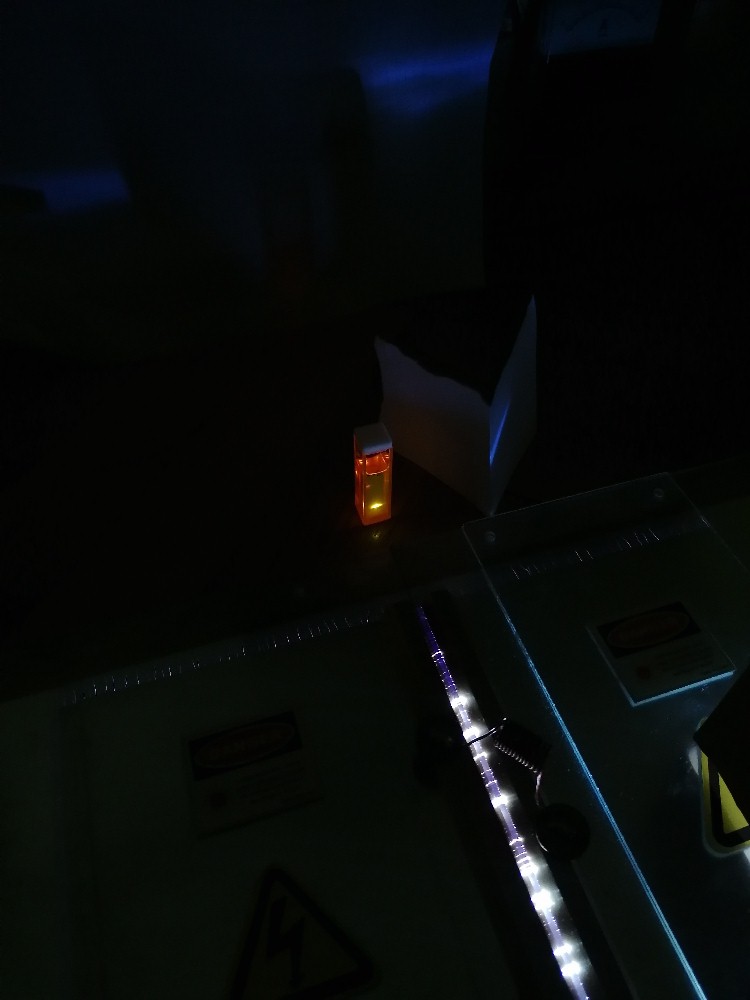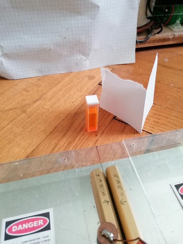 Die mit Rhodamin 6G gefüllte Küvette habe ich dann wieder vor den Laserkanal postiert und gehofft, rechtwinklig dazu Laseraktivität wahrzunehmen. Dem war leider wieder nicht so…