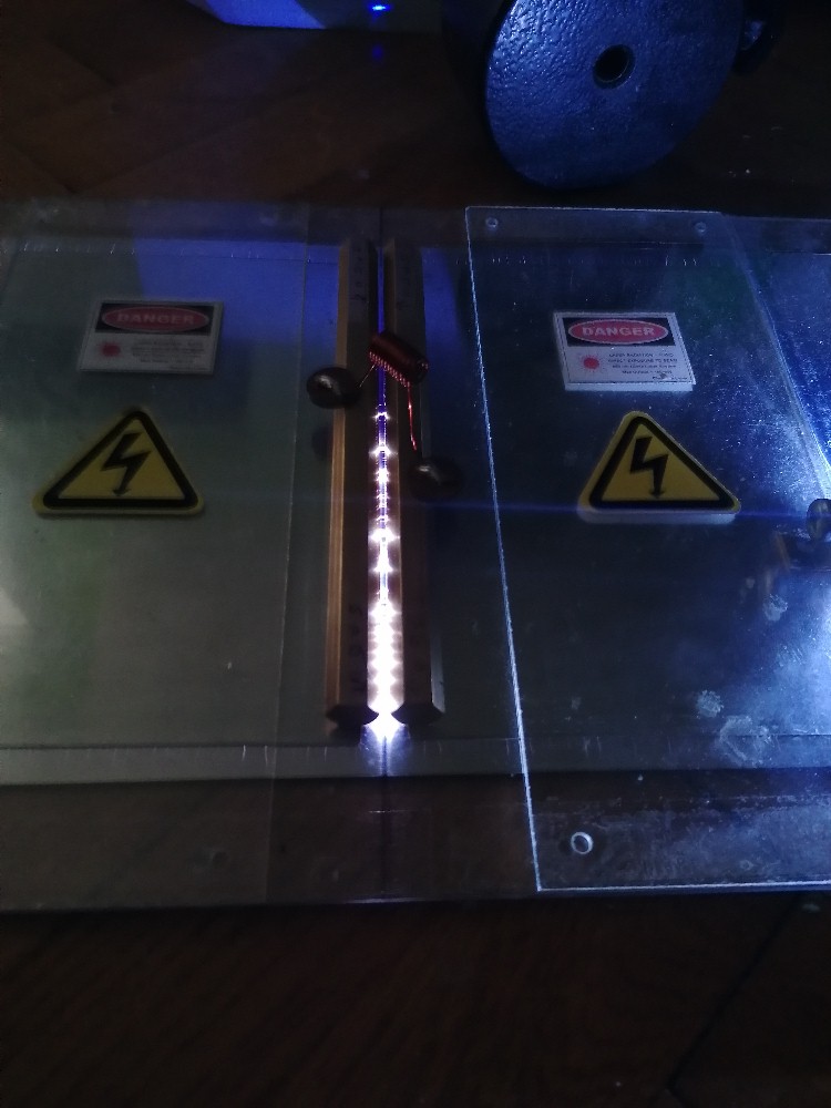 Der Abstand der beiden Metallleisten muss überall exakt gleich sein, damit es nicht an wenigen Stellen zu Überschlägen kommt. Gewollt ist wie schon erwähnt eine gleichmäßige Glimmentladung zwischen den beiden Kanten (siehe Abbildung unten).