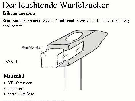 Reibt man in einem völlig dunklen Raum, mit gut an das Dunkle angepassten Augen, zwei Stücke Würfelzucker aneinander oder klopft mit einem Hammer auf dem ein Stück Würfelzucker festgemacht wurde auf einen harten Boden, so kann man ein schwaches bläuliches Licht erkennen. Diese Beobachtung geht noch auf Francis Bacon zurück und ist die ursprüngliche Form der Tribolumineszenz: Licht, welches beim Zerbrechen von Kristallen entsteht.